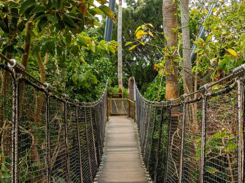 The park features several unique exhibits such as the ‘Planet Penguin’ that houses an iceberg with over 200 penguins, the ‘Katandra Treetops’ where you can walk among birds, and the ‘Aqua Viva’ showcasing jellyfish.